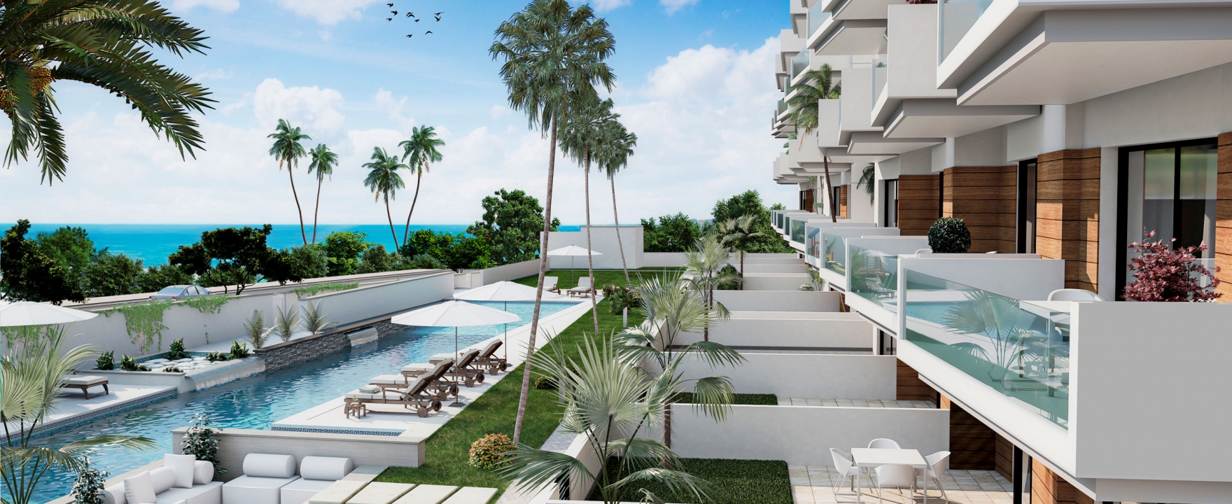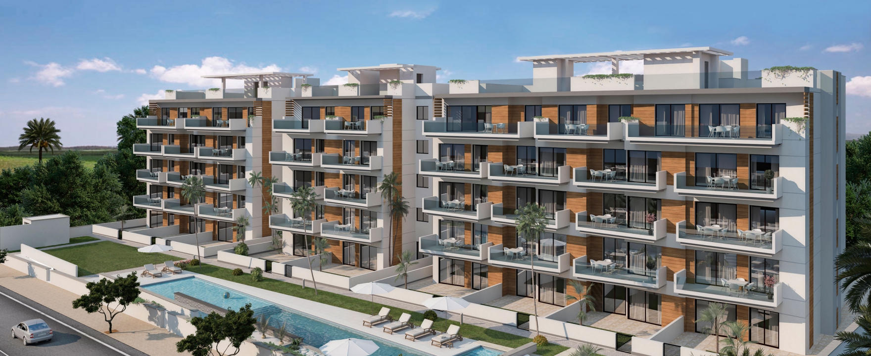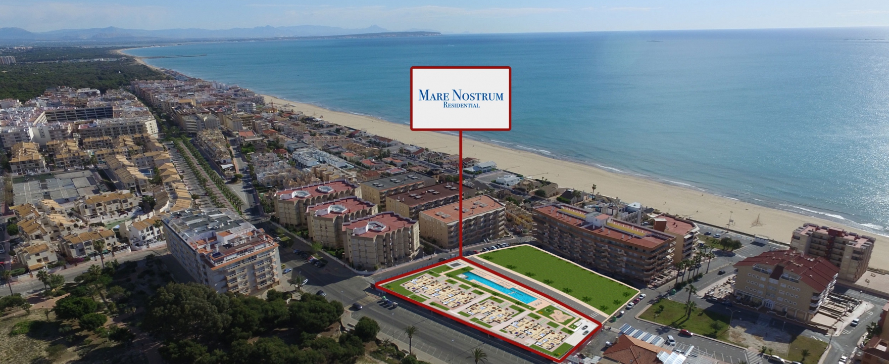 El residencial Mare Nostrum está situado en Guardamar del Segura a tan sólo 2 minutos a pie de la playa. Es un residencial privado con preciosos jardines, piscinas comunitarias y parking subterráneo.