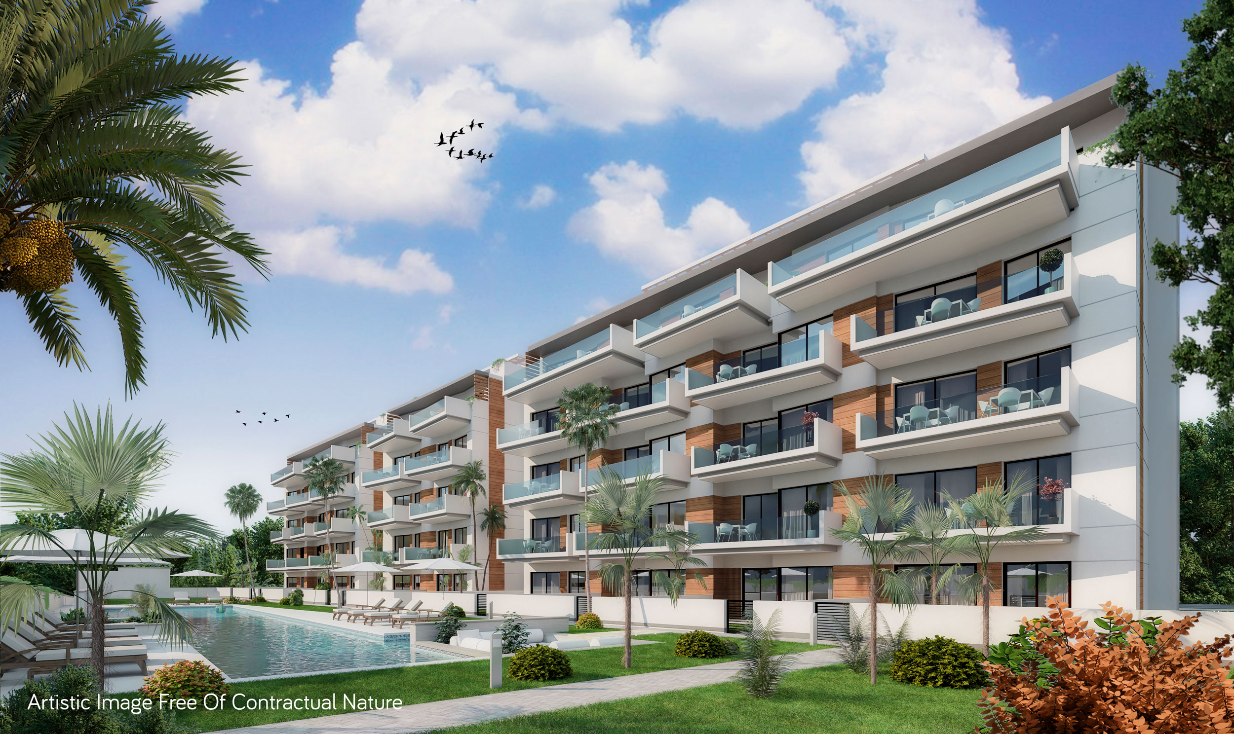 Está compuesto por 3 bloques de apartamentos de 5 plantas cada uno. Hay varios modelos de viviendas: planta baja con jardín, plantas centrales con terraza y ático con solárium. Los modelos A, B, C y D están disponibles de la planta baja a la cuarta planta.