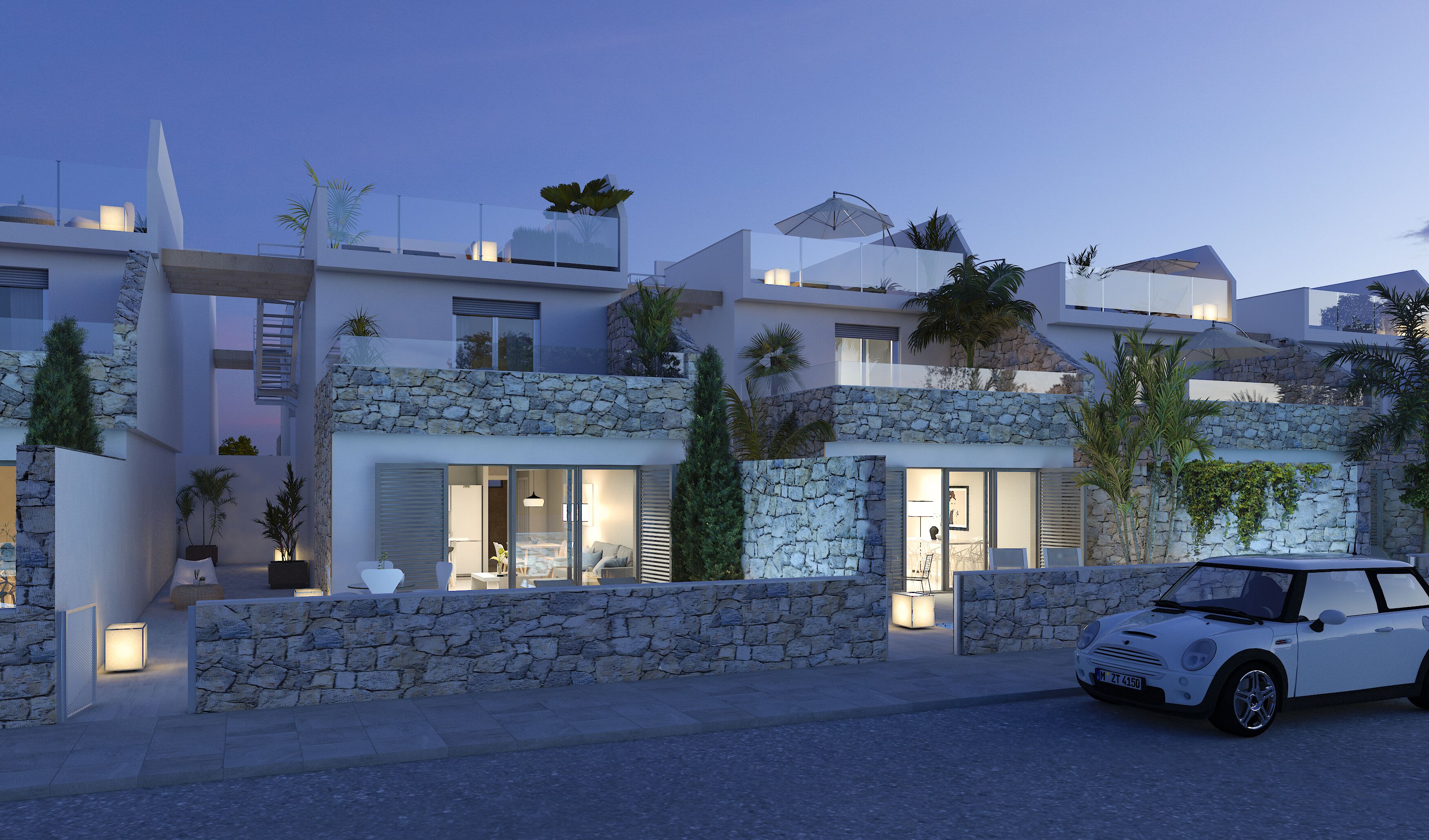 Detached villas with private pool and garage. 3 Bedrooms, 2 bathrooms and terrace space. Solarium. Close to sports facilities, parks, amenities and Las Palmeras Beach. Fully fitted kitchen and bathrooms. Preinstallation for air conditioning. Storage space on basement.