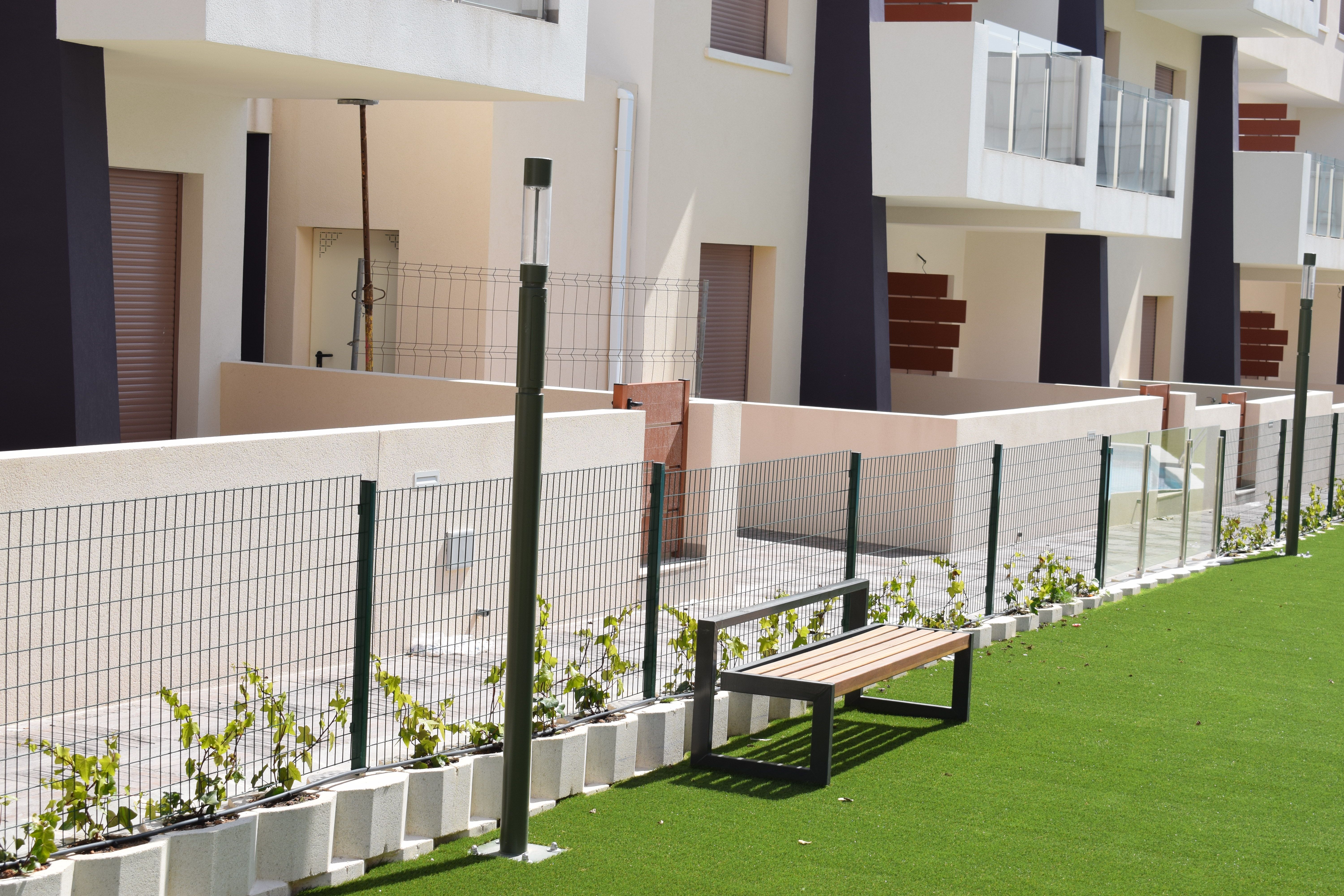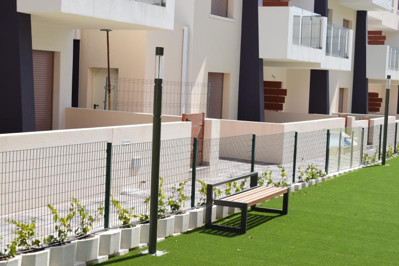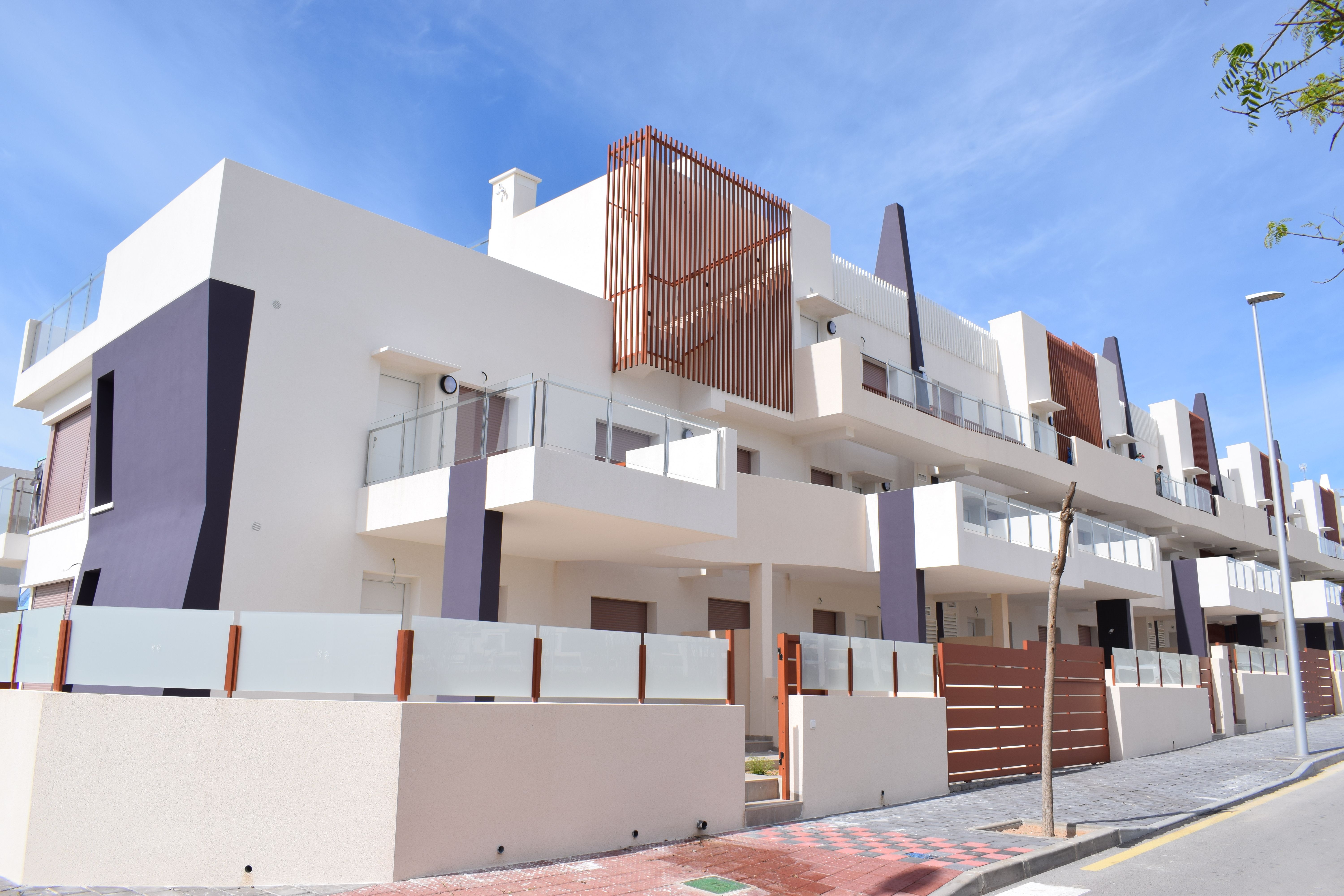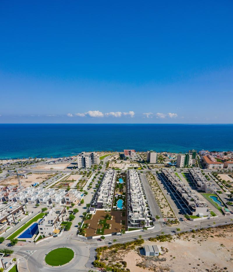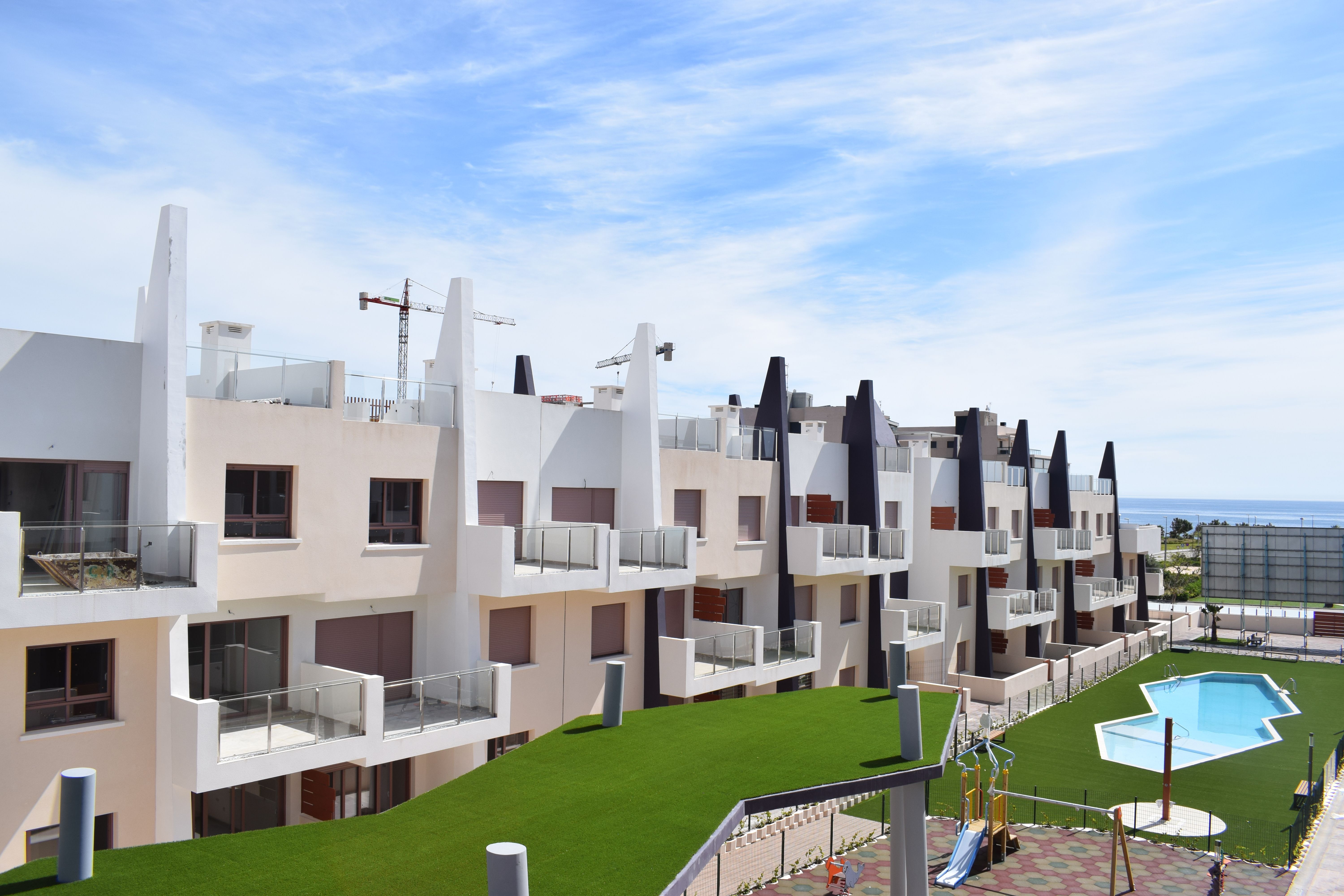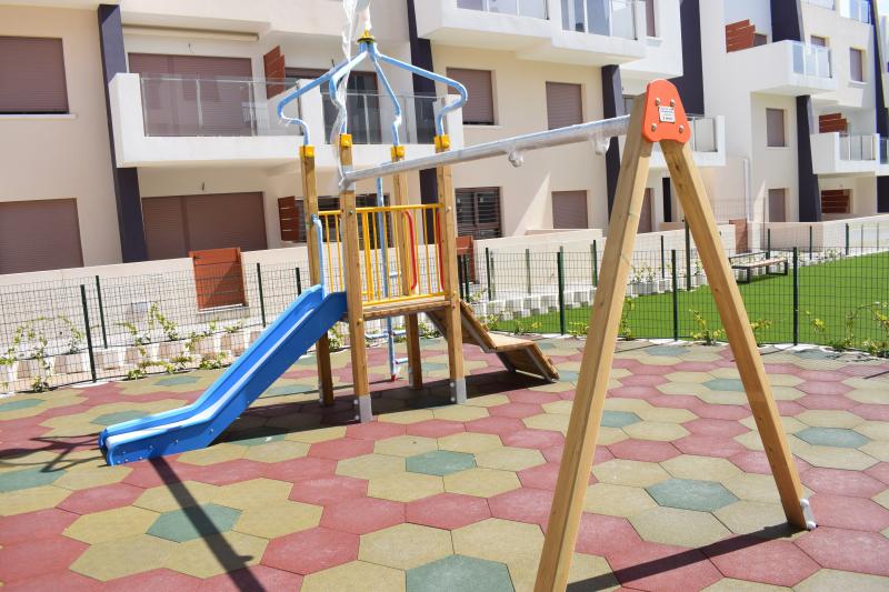 Residential of 104 apartments of 2 and 3 bedrooms with 2 bathrooms. Ground floors with garden and parking, first floor with balcony and terrace and penthouses with private solariums. Houses buildings with high quality materials and innovative design. Residential completed gated with perimetral wall, pedestrian access, wide communal areas with swimming pools, playground and leisure area and circuit healthy machines area for adults. Located in Mil Palmeras site, very near to the beach, surrounded by green areas and close to recreational areas, like golf courses and shopping centers.
