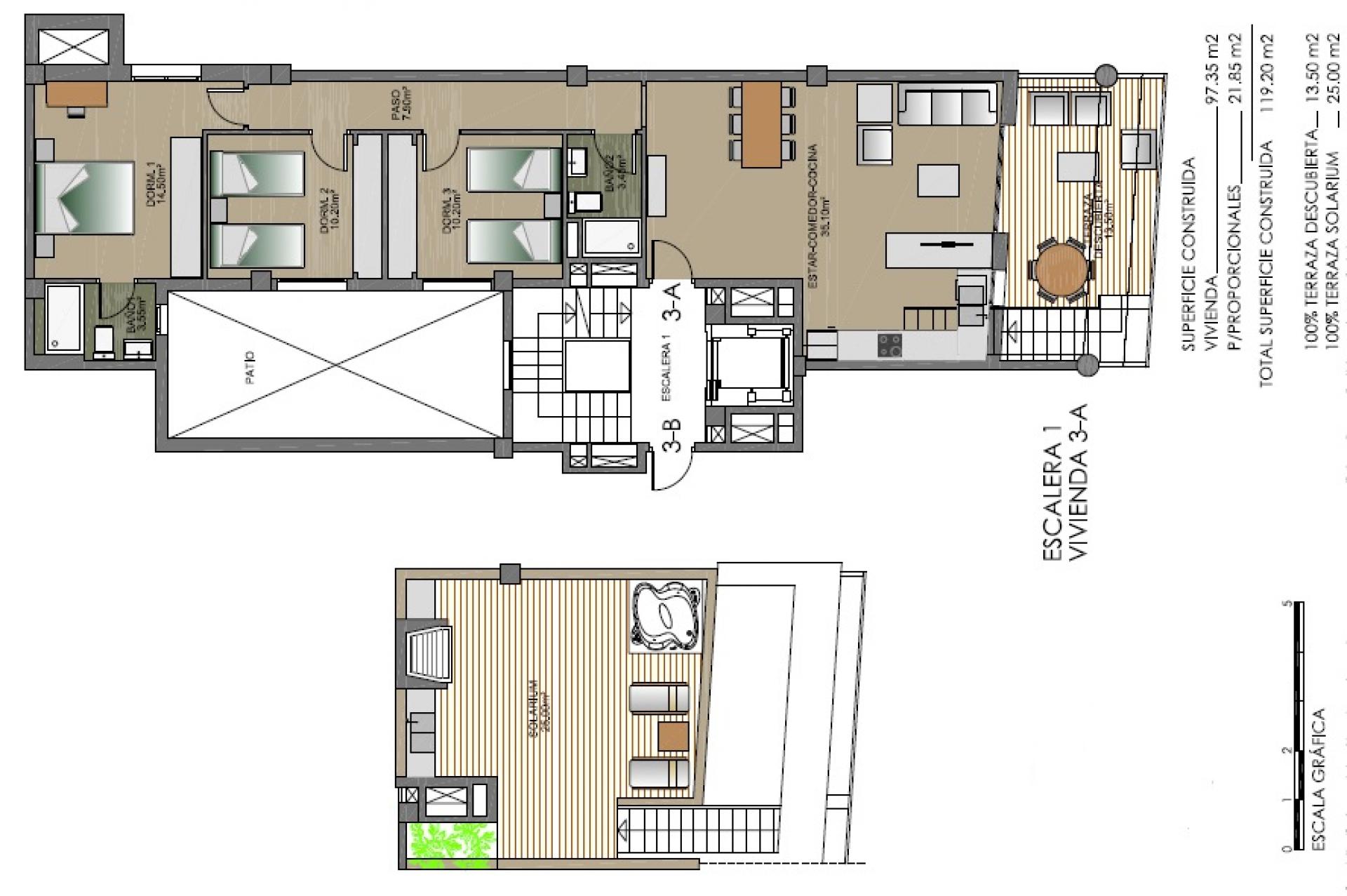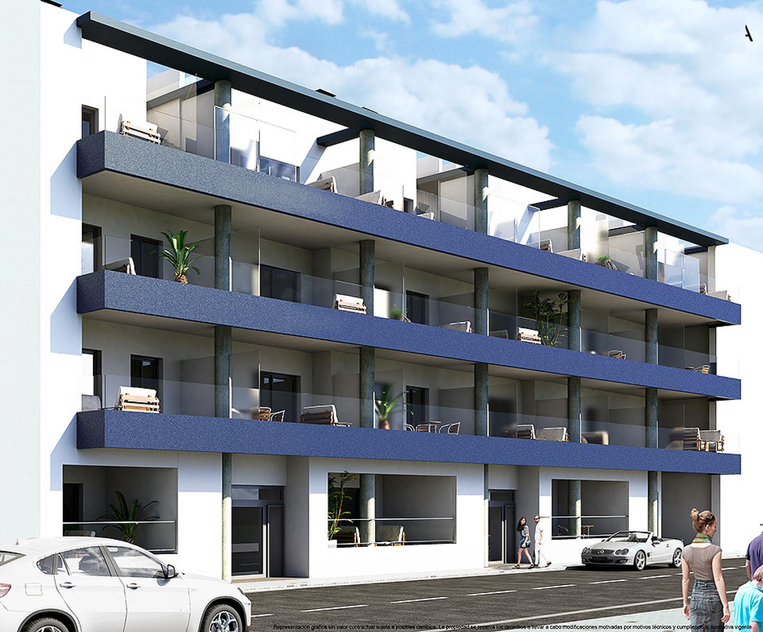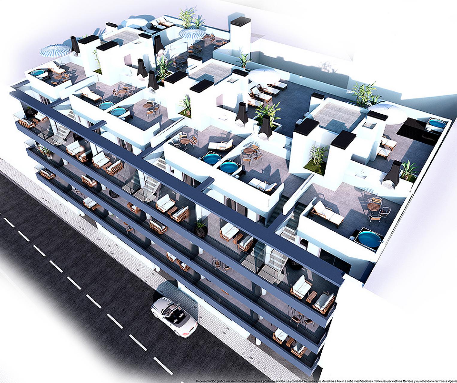 It is a building of 30 properties spread over 4 blocks and 3 floors, all with beautiful balconies and the penthouses also have a private solarium. These modern apartments consist of 2 or 3 bedrooms with fitted wardrobes, 2 bathrooms (one of them en suite) with underfloor heating, a bright living room and the open kitchen.