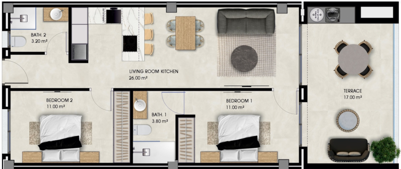Live the Mediterranean two steps away. Pinet Beach II are 63 apartments of modern design (2 bedrooms and 2 bathrooms), divided into two contemporary blocks designed to maximize comfort, privacy. Each house combines good finishes, open-plan spaces, private terrace and garage with storage room. Designed for both family and holiday rental investment.
